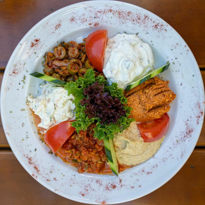Besonders beliebt sind unsere hausgemachten Mezze, die eine kleine Reise durch die Aromen des Orients bieten. Von cremigem Hummus bis zu pikantem Muhammara – jedes Häppchen ist ein Genuss.